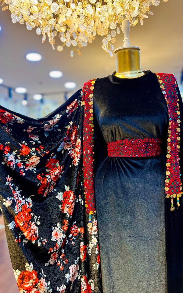 تتكون هذه العباءة من ثلث قطع: عباية تطريز يدوي مع ميكس من المخمل الملئ بالرسومات الوردية+قشاط مطرز يدويًا بالكامل وطويل+فستان مخملي فاخر بكم كامل….